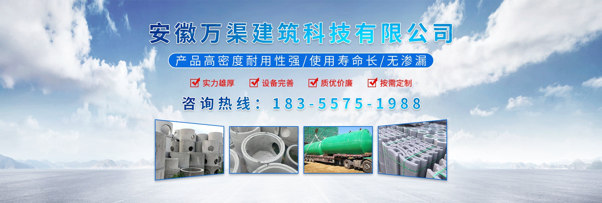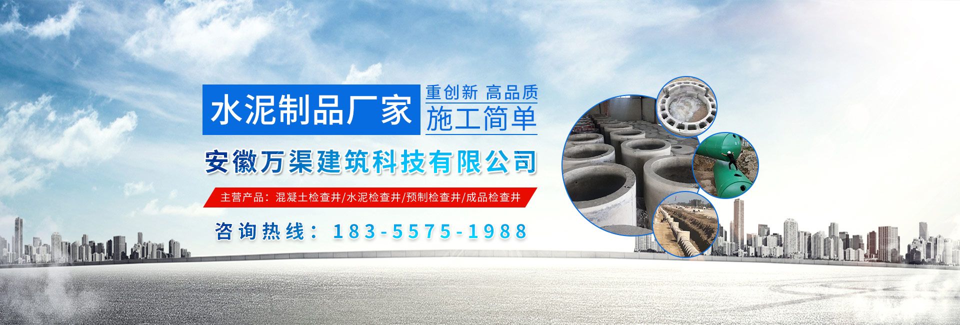 安徽萬(wàn)渠建筑科技有限公司是集研發(fā),生產(chǎn)制造,市場(chǎng)推廣為一體的綜合性企業(yè)。公司主要經(jīng)營(yíng)環(huán)保型預(yù)制鋼筋混凝土裝配式組合型檢查井和蓄水裝置等城建配套產(chǎn)品。產(chǎn)品生產(chǎn)過(guò)程采用獨(dú)特的生產(chǎn)工藝,機(jī)械化流水作業(yè)。產(chǎn)品大規(guī)模生產(chǎn),生產(chǎn)效率高,耗能少,成本低,產(chǎn)品使用壽命長(zhǎng)、免維護(hù)、無(wú)滲漏、無(wú)污染,符合“綠色環(huán)保,低碳節(jié)能”的發(fā)展要求,是傳統(tǒng)磚砌井池的理想替代產(chǎn)品。